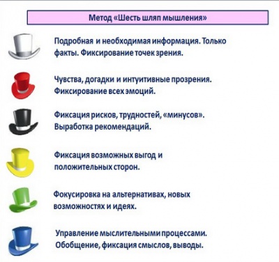 Очень часто в нашей голове происходит то же самое. Мы одновременно пытаемся удержать информацию, пытаясь при этом следовать логике. В сё в голове смешивается и мы не можем найти правильное решение. Эдвард де Боно разделяет мышление на шесть типов: белая шляпа, красная, чёрная, жёлтая, зелёная, синяя).