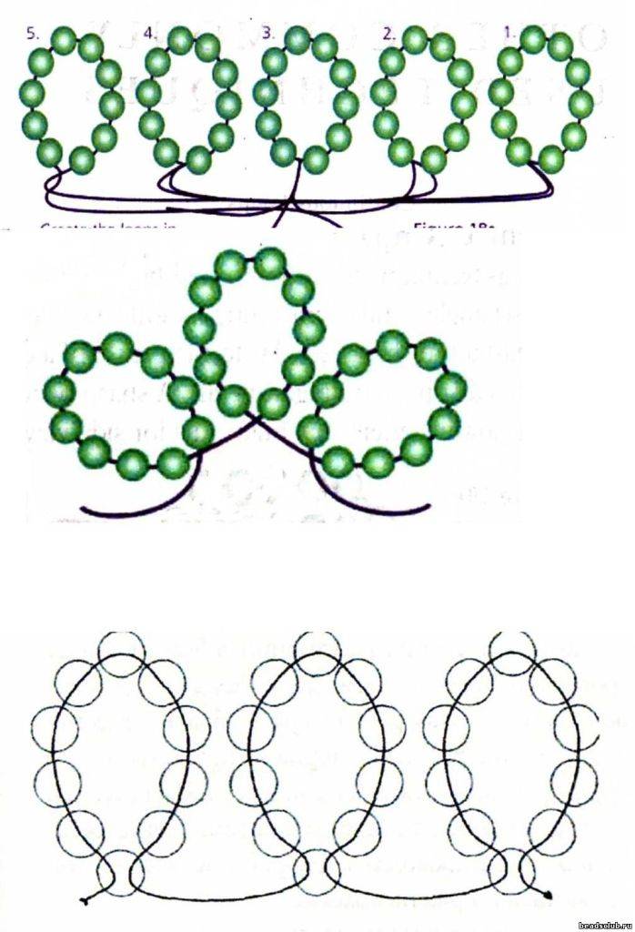 Конец проволоки, на который набирали бисер, продеваем через зеленую бисерину в обратном направлении (в сторону начала работы).
