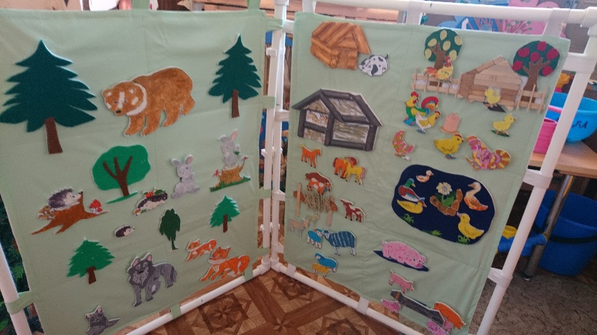 Материал: основа ширмы из клеенки, предметные картинки на липучках - нарисованные и покрыты лаком.