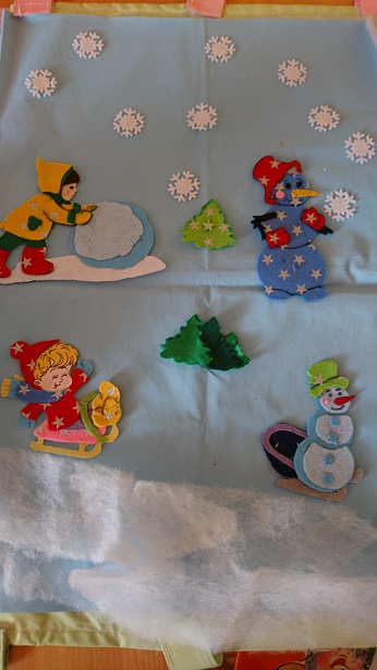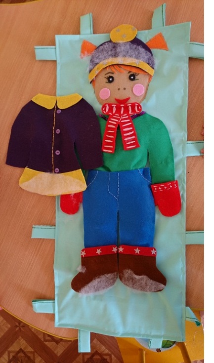 Элементы одежды и явлений природы изготовлены из фетра, которые размещаются в кармашках из клеенки.