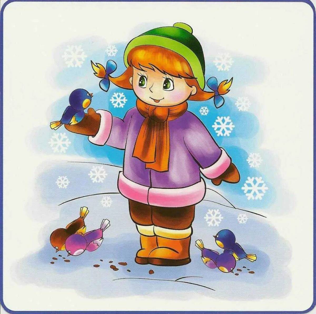 Беседа«Покормим птиц»с использованием иллюстраций синицы, воробья, сороки, голубя, вороны, снегиря и домашних птиц. Дать начальное представление о различии диких и домашних птиц.