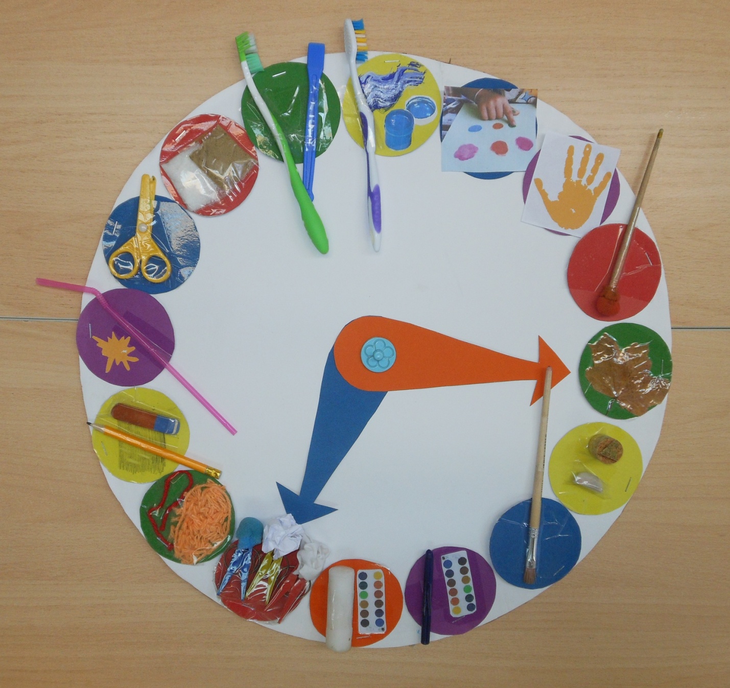 Когда всё колесо заполнится, добавить стрелки. С их помощью воспитанники сами смогут выбирать и комбинировать несколько техник нетрадиционного рисования в одной творческой работе.