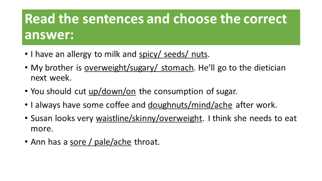Читают предложения, подставляют правильные слово из предложенных. Зачитывают предложения. 3. Составляют описание человека и его образа жизни, делают предположения о наличие заболеваний. Рассказывают сюжет картинки одноклассникам 4. Составляют предложения с грамматической конструкцией и новыми словами. Зачитывают предложения одноклассникам. | Предметные УД: - уметь правильно использовать новые лексические единицы. Коммуникативные УУД: