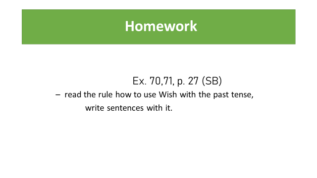 Рефлексивно-оценочный этап 5мин. | - обеспечить осмысление процесса и результата деятельности | Беседа, создание атмосферы эмоционального комфорта, использование упражнения. Презентация (слайд 13) Презентация (слайд 14) | Индивидуальная, фронтальная. | 1.Предлагает оценить факт достижения цели урока при помощи задания 6: допиши предложения о себе и своем здоровье, что бы ты хотел изменить в себе. (Do Ex. 6 and make a conclusion about your lifestyle. What would you change to stay healthy?) Предлагает оценить свою работу: выполнены ли задачи урока. Отвечаютнавопросыучителя. (-What was new for you today to talk about your health and regrets?) 2.Задаетдомашнеезадание. Write homework- Ex. 70,71, p. 27 – read the rule how to use Wish with the past tense, write sentences with it. Прощаетсясучениками. (The lesson is over. Good- bye!) | 1.Составляют небольшой рассказ о себе. Зачитывают его перед классом. Оценивают степень достижения цели. Отвечают на рефлексивные вопросы учителя. 2. Записывают домашнее задание. Прощаются с учителем. | Личностные УУД: - демонстрировать понимание изученного материала, осознание возможности применения полученных навыков в будущем. Регулятивные УУД: -оценить свою деятельность, степень достижения цели. Предметные:выполняют работу с информацией. |