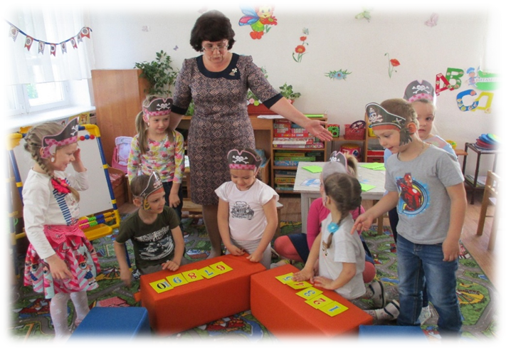 Д/игры: «Найди недостающую фигуру в каждом ряду», «Заряди пушку. Пиратские шляпы, карта, модули для строительства корабля, карточки с цифрами, «камни» с цифрами, сундук, пушка с ядрами, листочки в клеточку, карандаши простые, бананы, проектор, ноутбук, презентация к занятию.