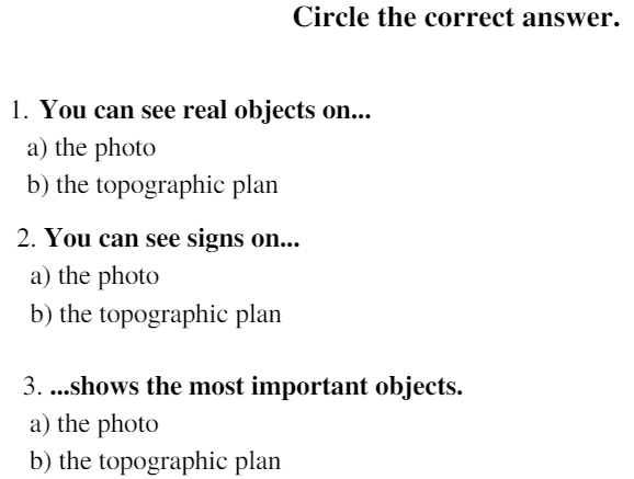 Знакомство с понятием «план местности» происходит с помощью задания «multiplechoice» на основе наглядности. Учащиеся, опираясь на картинку, изображающую снимок местности с воздуха и топографический пландолжны самостоятельно ответить на вопросы и прийти к выводу о том, чем отличается топографический план от фотографического изображения. С помощью этого задания происходит первичное знакомство с новым понятием, причем учащиеся самостоятельно анализируют изображения, учатся находить различия и самостоятельно делать выводы. Таким образом, на первый план выходит приобретение нового предметного знания, но происходит это на изучаемом английском языку. Кроме того, сразу в силу вступает мыслительный (cognition) компонент метода CLIL.