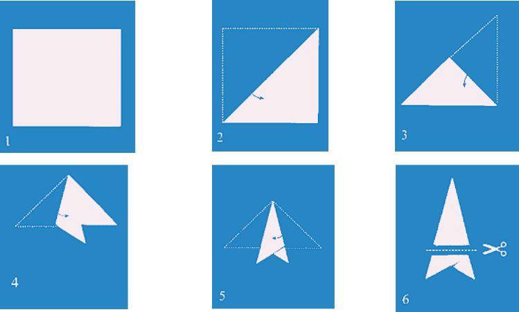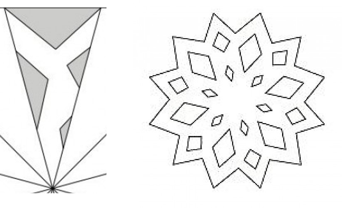 надо сложить правильный треугольник (в развернутом виде — шестиугольник, из которого будет вырезаться снежинка.