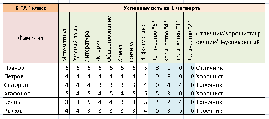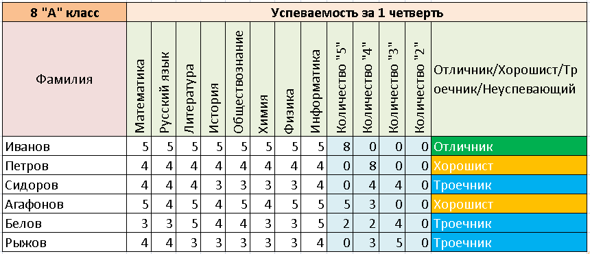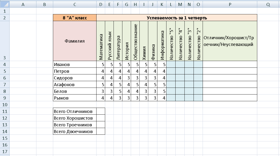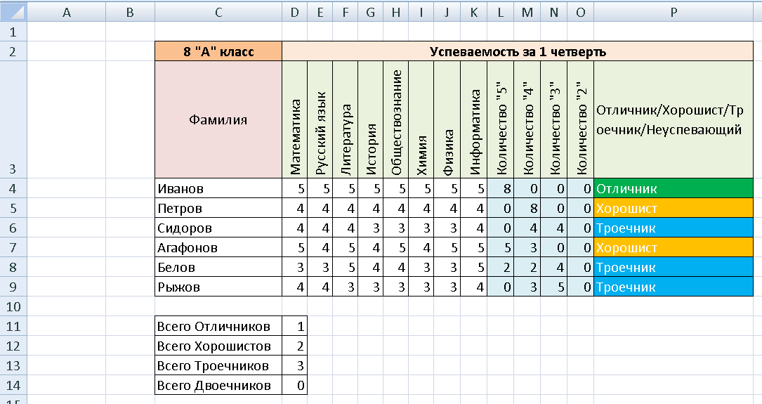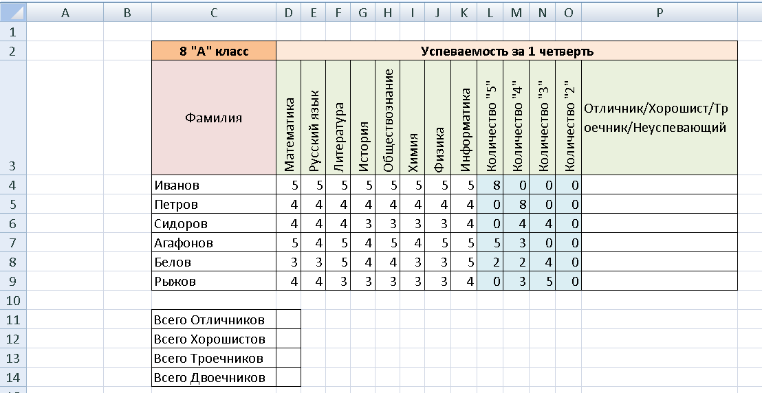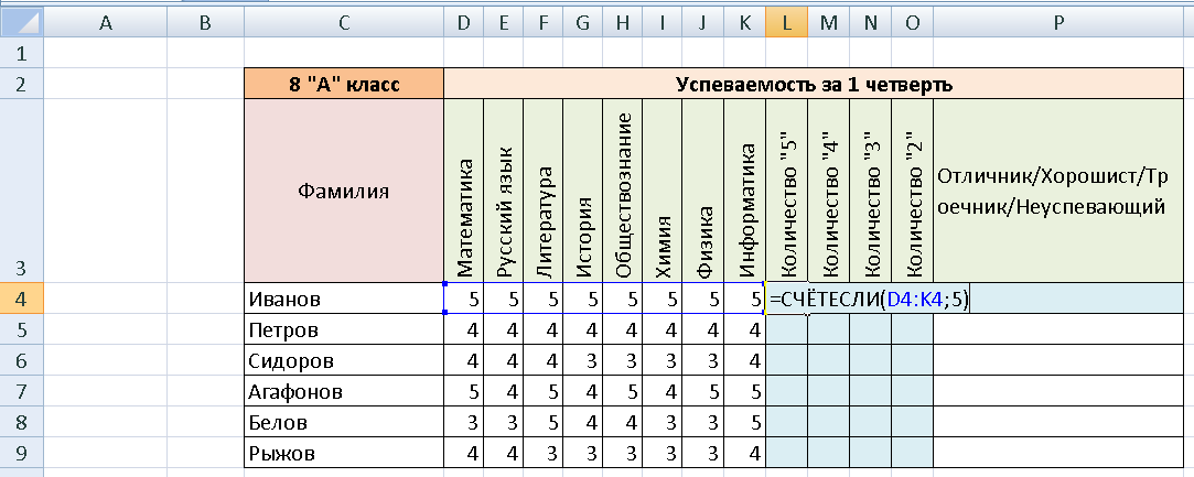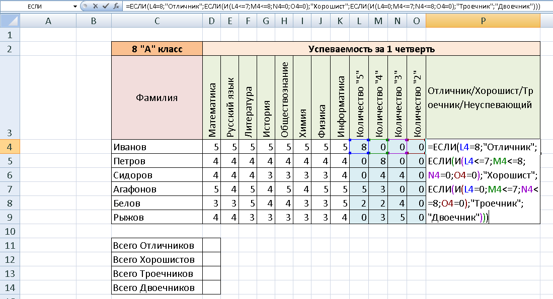 В ячейку P4 введите формулу:=ЕСЛИ(L4=8;"Отличник";ЕСЛИ(И(L4<=7;M4<=8;N4=0;O4=0);"Хорошист";ЕСЛИ(И(L4<=7;M4<=7;N4<=8;O4=0);"Троечник";ЕСЛИ(И(L4<=7;M4<=7;N4<=7;O4>0);"Двоечник"))))