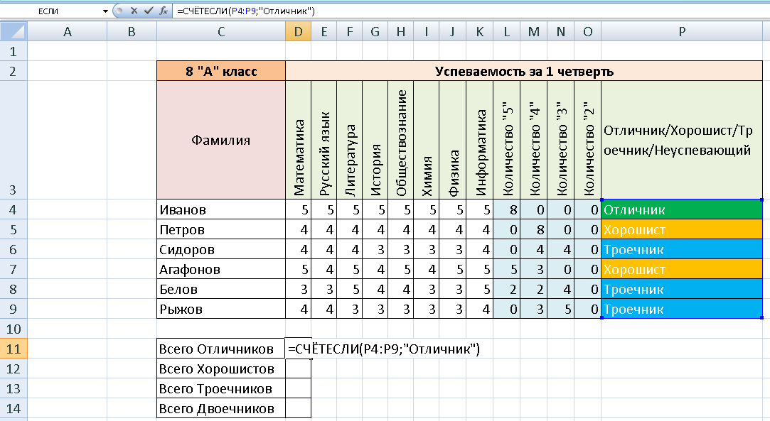 Осталось посчитать количество. В ячейку D11 вводим формулу =СЧЁТЕСЛИ(P4:P9;"Отличник")