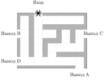 9. На рисунке изображён лабиринт. Паук заползает в лабиринт в точке «Вход». Развернуться и ползти назад паук не может. На каждом разветвлении паук выбирает путь, по которому ещё не полз. Считая выбор дальнейшего пути случайным, определите, с какой вероятностью паук придёт к выходу