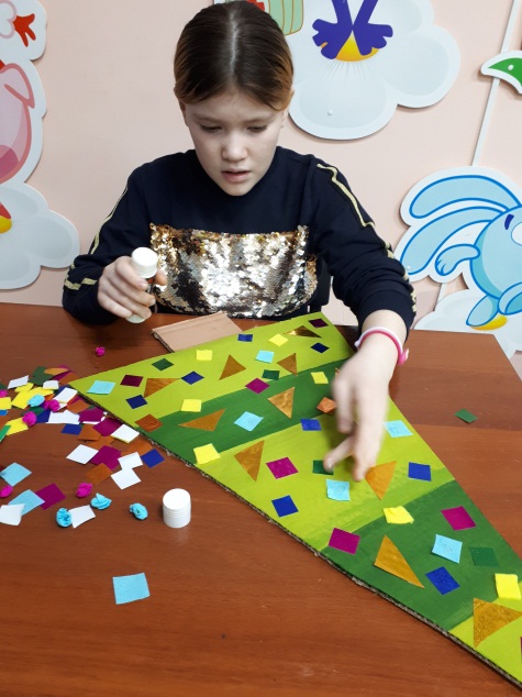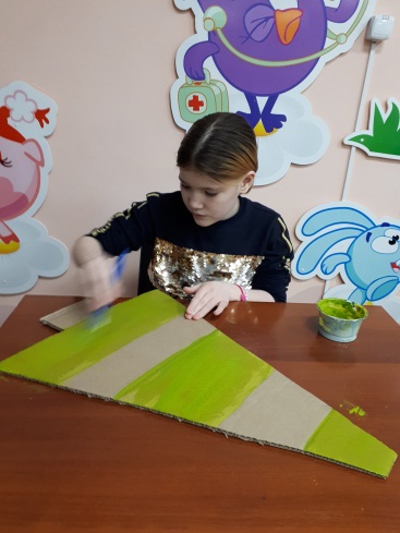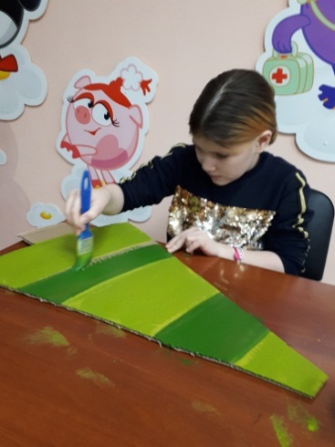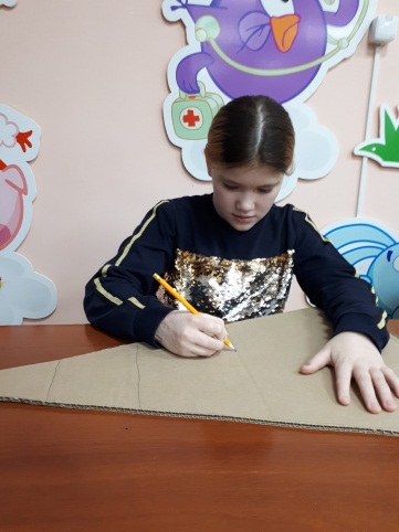 Столы, стулья, картон от коробок, простой карандаш, ножницы, краски-гуашь, кисти, стаканчики для воды, ветошь, цветная бумага, самоклеящийся фетр, цветная фольга, клей-карандаш и ПВА.