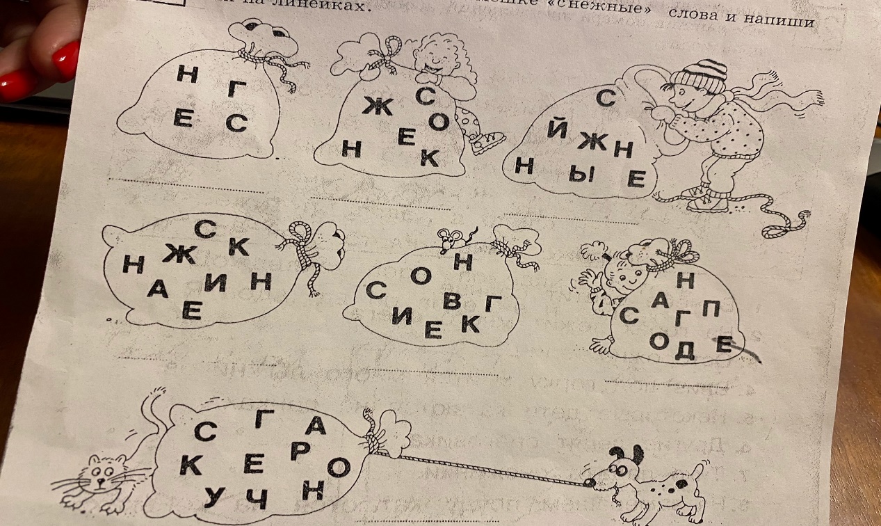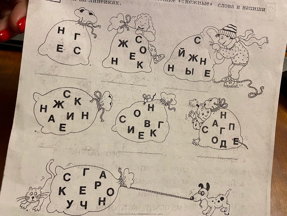 3. Составь из букв «снежные» слова и произнеси их четко. (7 мешков)