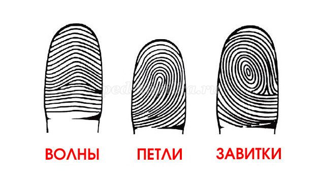 Рассмотреть с детьми рисунки с отпечатками пальцев (дуги, петли, завитки).