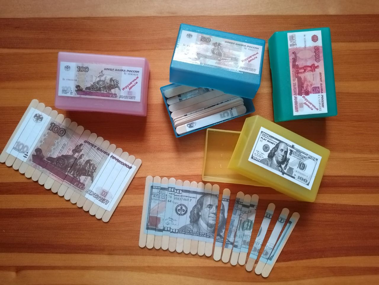 Таким образом, возникла идея возникновения «Многофункционального развивающего финансово-экономического ЧУДО-БОКСА» куда вошли 50 игр для детей разных возрастов, начиная с младшей группы, с методическими рекомендациями к ним. А так же список рекомендуемой детской литературы для прочтения с детьми и список обучающих мульфильмов по финансово-экономической грамотности, на прилагаемом электронном носителе (флешке). Сейчас практически во всех популярных современных мультфильмах есть серии посвящённые финансово-экономической грамотности – Смешарики, Фиксики, Барбоскины, Три кота. А вымышленные герои различных авторов (Пёс Мани Бодо Шефера, Кот Белобок в образовательной программе, Феечка Копеечка в образовательной программе Пермского края, девочка Копеечка и мальчик Рублик из сказки Александра Капчука) способствуют формированию заинтересованности и более лёгкому усвоению информации. Именно поэтому время от времени в нашем ЧУДО-БОКСЕ может поселиться один из персонажей, что очень привлекательно не только для детей младшей группы, но и для старших групп. Считаю немаловажным фактом и само оформление игр. Оно должно быть аккуратным, удобным и безопасным в использовании и конечно, эстетически привлекательным. Как я уже отметила, среди этих игр есть и авторские. В д/и «Кто чем занят?» использовала игрушки от киндер-сюрприза, дети учатся по действиям определять их деятельность и сопоставлять с соответствующей картинкой. Для игры Мемори «Монеты» - использованы крышки от пластиковых бутылок и монеты, у детей развивается память, мышление, пространственная ориентация, внимательность. Деревянные палочки от мороженого послужили пазлами для игры «Сложи купюру», в процессе игры происходит развитие внимания, умение доводить начатое до конци. В игре «С пандой по свету» дети знакомятся не только с народами мира, но и с денежными единицами разных стран. В поисках клада детям не обойтись без фонарика, с которым они на просвет определяют наличие содержимого конверта. Для сохранения интереса, содержание конверта меняется. А лупа понадобится для игры «Найди отличия». На двух одинаковых купюрах дети находят отличия (на одной из которых воспитатель изображает лишние элементы.У детей развивается внимательность, усидчивость, настойчивость.