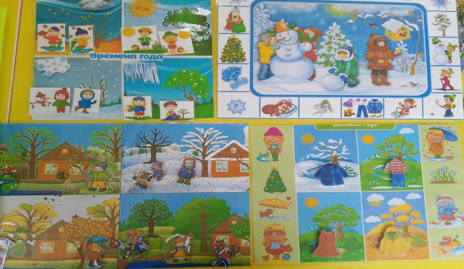 На игровом поле изображены четыре времени года . Играющих от 2 до 4 детей ,каждый выбирает себе определенное время года. Затем детям предлагается выбрать из папки тот предмет . который относится к выбранному времени. С помощью липучек распределить на игровом поле.