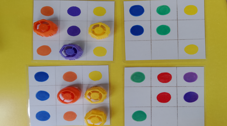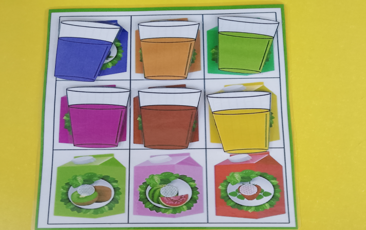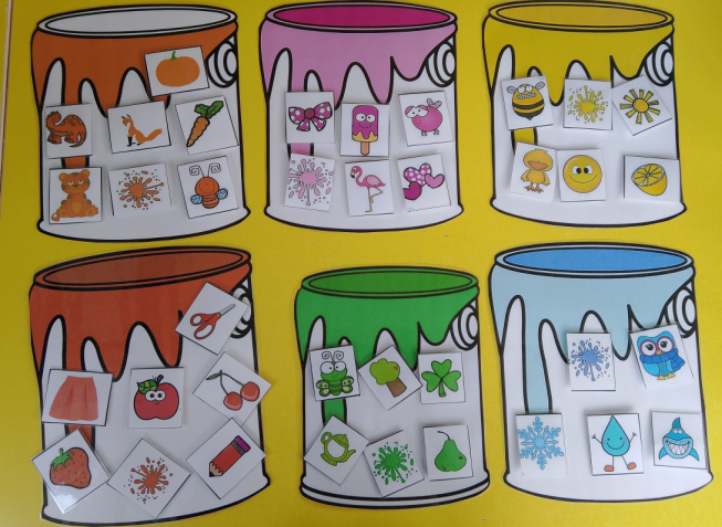Для игры понадобятся цветные баночки вырезанные из бумаги и заламинированные липучки на клеевой основе. Участвовать в игре могут несколько детей . Детям раздают карточки с изображением баночек с крышками определенного цвета и поднос с различными цветными картинками . Задача детей на скорость найти предметы такого же цвета как крышка на банке. Потом когда собраны все предметы , дети могут поменяться карточками.
