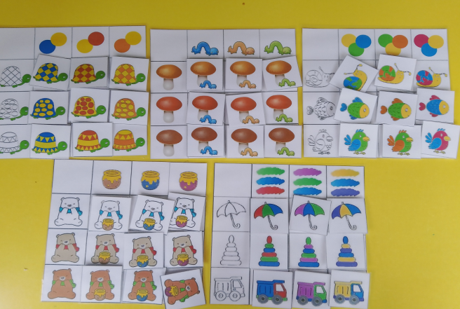 Воспитатель раздает детям карточки на которых справа изображены картинки улитка, рыба, попугай . а сверху изображены три круга определенного цвета. Ребенку нужно подобрать в каждый ряд соответствующую картинку чтобы она совпадала с предметом по форме ,виду и цветовой гамме. Играть могут сразу несколько игроков, и меняться карточками.