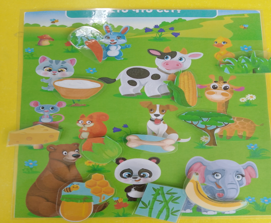 Ход игры: Игра индивидуальна, на одного игрока одна карточка с изображением животных и липучки с изображением еды. Ребенок должен определить что ест животное и прилепить соответствующую карточку каждому животному.