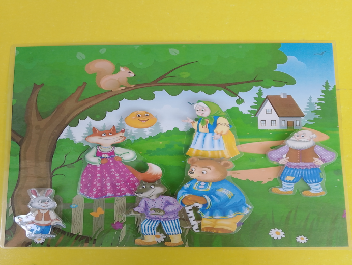 Воспитатель дает заламинированную картинку с фоном и карточки с липучками и героями сказки. Взрослый просит ребенка воспроизвести последовательность сказки и сопровождать действия рассказом о сюжете сказки .Почему он клеит именно эту картинку сначала , а эту потом .Можно попросить ребенка описать каждого героя и рассказать о его характере.