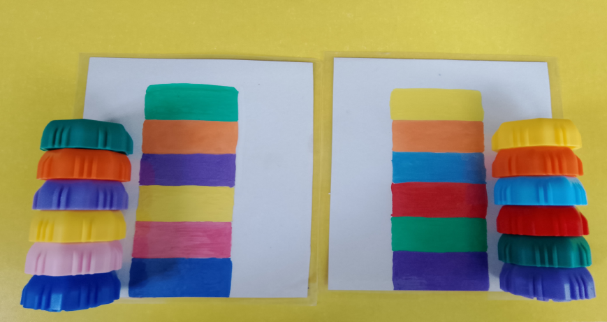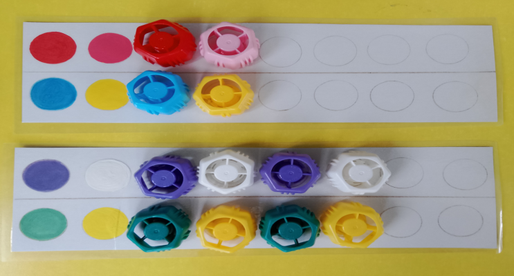 С карточками можно работать индивидуально, можно работать в паре. Воспитатель раздает карточки с определенными заданиями и просит детей продолжить последовательность , сделать по образцу, или дополнить недостающие предметы. Во всех играх используются наборные карточки и пластиковые крышки от фруто-няни.