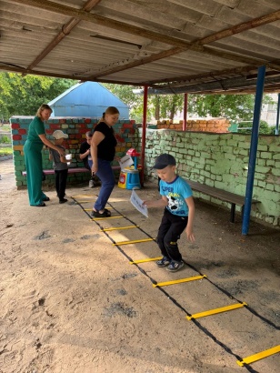 "Мы веселые ребята": участники бегают по лестнице, выполняя различные движения по сигналу.