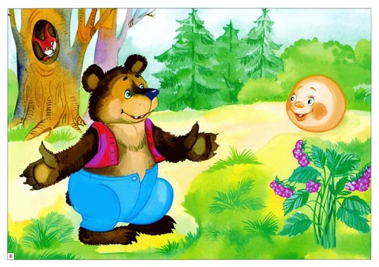 Покатился Колобок дальше, песенку весёлую напевает, а навстречу ему Медведь идёт, мёд с лап слизывает, мух отгоняет. Жарко ему.