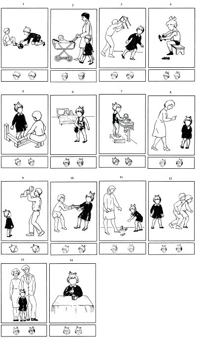 Экспериментальный материал: 14 рисунков (8,5x11 см) выполнен в двух вариантах: для девочки (на рисунке изображена девочка) и для мальчика (на рисунке изображен мальчик). Каждый рисунок представляет собой некоторую типичную для жизни ребенка ситуацию. Лицо ребенка на рисунке не прорисовано, дан лишь контур головы. Каждый рисунок снабжен двумя дополнительными рисунками детской головы, по размерам точно соответствующими контуру лица на рисунке. На одном из дополнительных рисунков изображено улыбающееся лицо ребенка, на другом - печальное.