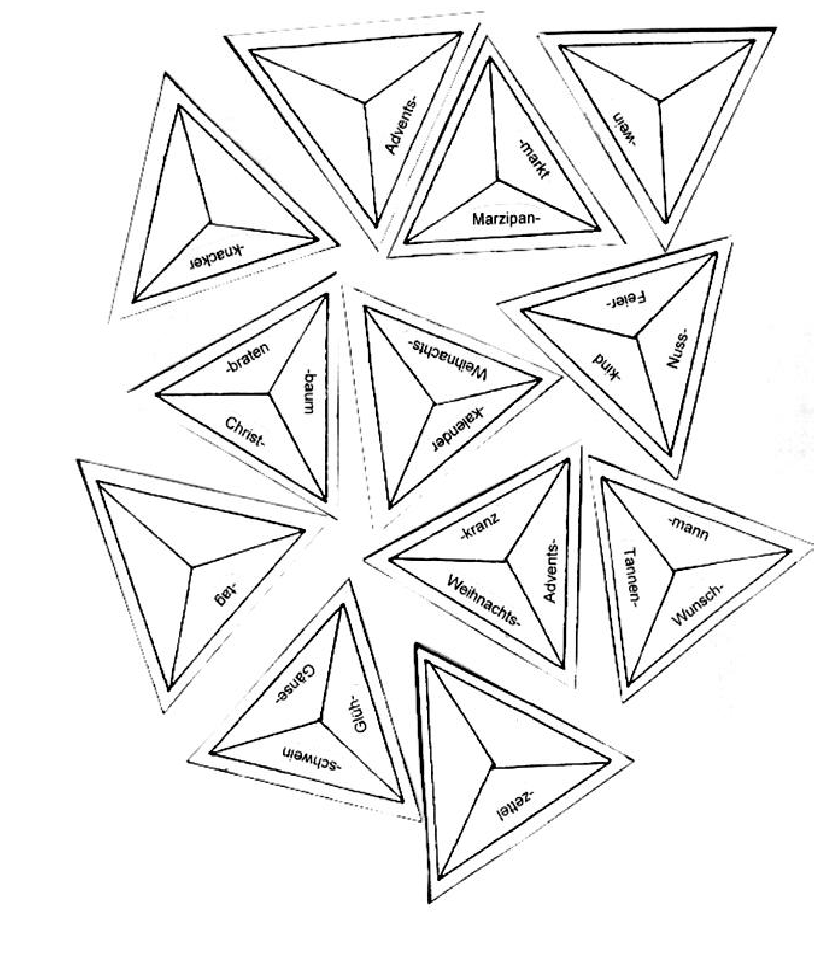 -mann, -baum, -plätzchen, -krippe, -fest, -glocke, -markt, -kerze, -stern, -karte, -lied, -gedicht, -traditionen. (Приложение 2)