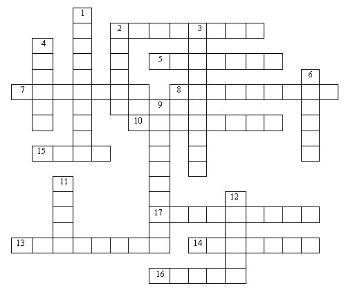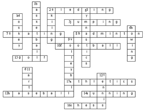Horizontal:2. Катание на санках. 5. Прыжки. 7. Бывает фигурное. 8. Игра с ракетками и воланчиком. 10. Спортивная игра с мячом. 13. Бейсбол. 14. Бег. 15. Гольф. 16. Шахматы. 17. Легкая атлетика.