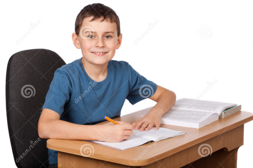 (The boy is sitting at the desk. He is writing in his notebook. He is doing his homework.)