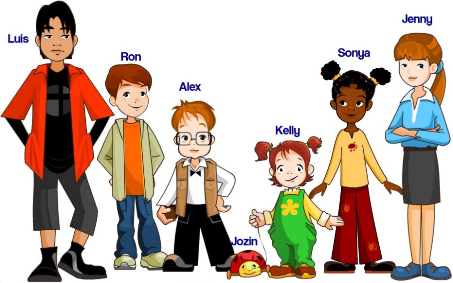 (Я диктую описания людей, изображённых на картинке, ребята называют имена)