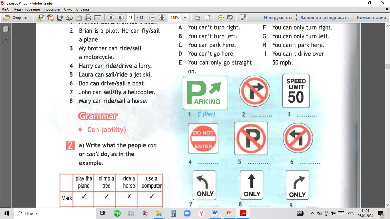 2. 3. 4. 5. 6. 7. 8. 9. 10. | Вам нужно распределить слова и ответить на вопрос What is tall and what is high? Теперь вы должны сложить эти кусочки таким образом, чтобы получилась страна. Затемвамнужноназватьчастистраныисамустрану. Now you must put these pieces to get the whole country. Then you should name its parts. A curious problem. When did Alfred rich school? Alfred had a very long walk to school every morning. When he got to the church, he had walked one-quarter of the way, and it was usually half past eight on the church clock when he passed it. When he got to the railway station, he had walked one-third of the way, and it was usually twenty-five minutes to nine on the station clock when he passed it. At what time did he usually reach school? Частистраны, флаги. You should match the countries and the flags. Определить, к какой части страны относится каждый флаг. В этой точке маршрута вам предстоит разгадать кроссворд. Ещеодназадачка. A curious problem. How many miles a day? Harry walked 117 miles, beginning on Sunday morning and finishing on Monday evening of the following week. He walked each day one mile farther than the day before. How many miles did he walk each day? Countable/uncountable Распределяем картинки по группам «исчисляемое/неисчисляемое». Назвать картинки, вставить в слова пропущенные буквы. A curious problem. The weight of the fish. Once Tom and his father went fishing. Tom caught a good fish and asked his father, “How much can it weigh?” His father put his answer in the form of a little problem. “Imagine,” he said, “that the tail weighs 9 ounces; the head weighs as much as the tail and half the body; and the body weighs as much as the head and the tail together. Now, what is the weight of the fish?” Tom could not answer his father’s question. Can you? Сопоставить дорожные знаки с их описанием. | Участники команды распределяют картинки по группам tall и high (высокий). Участники должны сложить части карты и назвать части страны, а также саму страну. Участникикомандырешаютзадачу. One twelfth of the way takes Alfred 5 minutes, so it usually takes him one hour to get to school. Two third of the way will take him forty minutes. If he passes the railway station at twenty-five to nine, so he will come to school in forty minutes, that is at nine fifteen (at a quarter past nine). Команда получает карту страны и флажки, расставляет флажки на карте. Команда сообща разгадывает кроссворд. Harrywalked 9 days. On Sunday he walked X miles. On Monday (X+1) On Tuesday (X+2) On Wednesday (X+3) On Thursday (X+4) On Friday (X+5) On Saturday (X+6) On Sunday (X+7) On Monday (X+8) Make the equation [i’kweiʒǝn]: 9X+36=117 9X=117-36 9X=81 X=9 So on Sunday he walked 9 miles, on Monday – 10 miles, on Tuesday – 11, on Wednesday – 12, on Thursday – 13, on Friday – 14, on Saturday – 15, on Sunday – 16, on Monday 17. Если возникают затруднения, напоминаем, что исчисляемые существительные можно сосчитать. К неисчисляемым существительным относятся материалы, жидкости, вещества. If the tail weighs 9 ounces, the head has the weight of (9+X) ounces, and the body is 2X ounces. We know that the weight of the tail and the head is equal to the weight of the body, so we can make the equation 9+(9+X)=2X 18+X=2X X=18 So the tail is 9 oz., the body is 36 oz., the head is 27 oz., the whole fish weighs 72 oz. Участники получают картинки с дорожными знаками, их описание. Сопоставляют знаки с их значением. | Если возникают затруднения, даем подсказкуhigh – предметы, tall – люди и вытянутые вверх предметы. Boundless, endless space before me. Blue sky only draws my eyes. Если возникают затруднения, даем подсказку. Like a passing pilgrim holy, I behold your rolling plains. While beyond the outskirts lowly Rustling poplars’ foliage wanes.