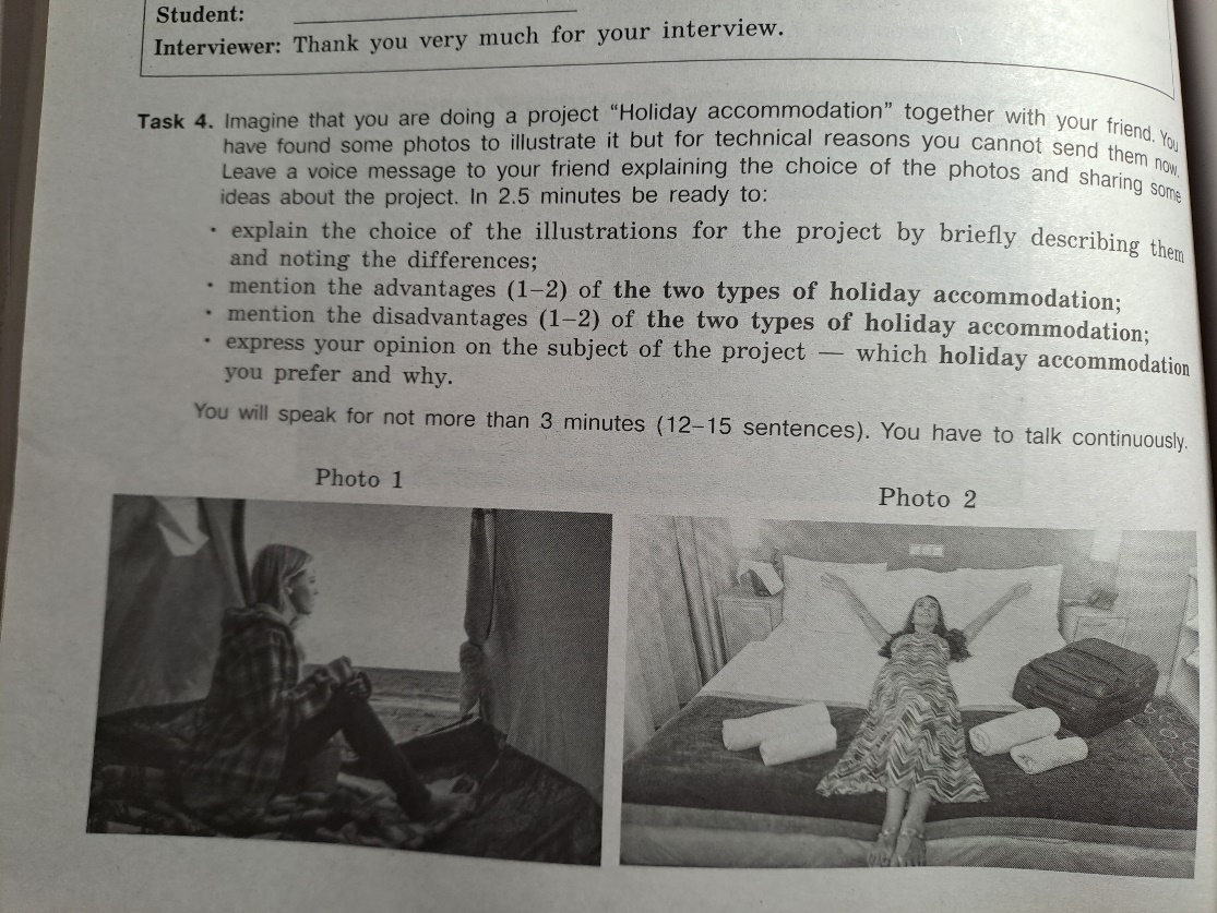 Imagine that you and your friend are doing a school project “Types of holidays”. You have found some photos to illustrate it but for technical reasons you cannot send them now. Leave a voice message to your friend explaining your choice of the photos and sharing some ideas about the project.