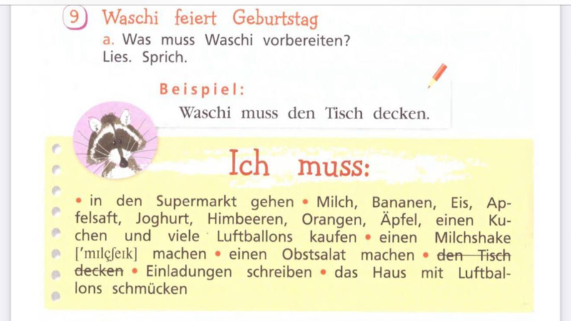 III Этап(Усвоение нового материала) | 10минут | Учитель вновь показывает изображения семьи и просит сказать, чем они занимаются. (Приложение 3) -Schau dir das Foto an. Was machen sie? … -Können wir sagen, dass jede Person etwas zu tun hat? … Учитель просит открыть учебник и представить, что герой является их питомцем, членом их семьи, описать его задачи в рамках подготовки к дню рождения. (Приложение 4) -Öffnen Sie das Lehrbuch auf Seite 60. Stellen wir uns vor, der Waschbär (Waschi) ist unser Haustier, und er hat auch viel zu tun! Er hat Geburtstag! … -Was muss er vorbereiten? … -Schreiben sie das! Подведём итог, что глагол обозначает то, что мы должны что-то сделать, это наша ответственность, и за нее мы отвечаем перед собой (по собственной воле, других вариантов нет). Далее учитель проводит динамическую паузу с помощью стихотворения (Приложение 4) | Обучающиеся отвечают на поставленный учителем вопрос, открывают учебник, просматривают задания. Формулируют устное высказывание с опорой. Записывают в тетрадь. | Фронтальная, индивидуальная форма работы | Обучающиеся ознакомились с примером употребления модального глагола müssen, развили навыки построения повествовательного предложения с прямым порядком слов, отработали навык письменной речи. Фронтальная и индивидуальная формы контроля. |