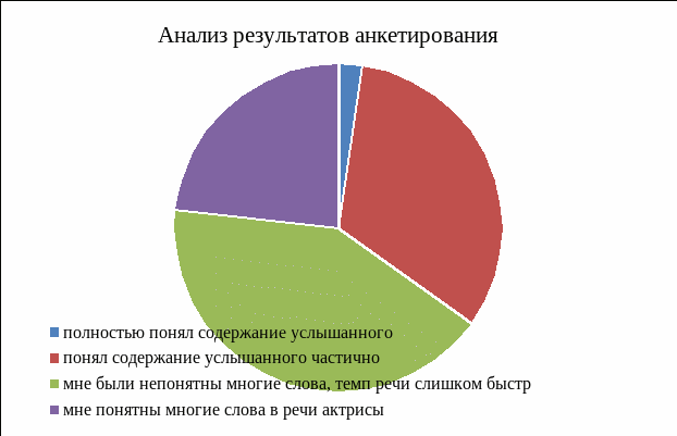 Для того, чтобы определить, насколько проблематичным является восприятие американской речи на слух, мною было проведено исследование, где группой респондентов выступили обучающиеся МБОУ Гимназия «Эврика» им. В.А. Сухомлинского в количестве двадцати четырех обучающихся. Суть эксперимента заключалась в том, что обучающимся предлагалось к просмотру видео с американскими актрисой/актером, по итогам просмотра которого необходимо было ответить на вопросы к нему (см. приложение 1), что позволило соотнести, понято ли содержание видеоряда учениками полностью, получилось ли извлечь специфическую информацию, либо же речь актеров и ее содержание остались непонятыми. По результатам, представленным в приложении 2, можно сделать вывод, что 100% обучающихся не понимает смысл сказанного в полном объеме. Для все тех же 100% препятствием для полного понимания стали незнакомые слова, а также фонетическая составляющая видео, непривычная быстрота темпа речи и редуцирование множества гласных. Резюмируя вышесказанное, можно с уверенностью отметить недостаточность альтернативной информации об американском варианте английского, невозможность увидеть и изучить транскрипцию американского варианта английского, его фонетические особенности, а также часто употребляемую американскую лексику. Как показало анкетирование, аудирование, с которым мы встречаемся в рамках школьного курса, также является недостаточным для понимания носителей американского варианта английского языка, считающимся основой разговорного.