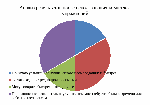 В рамках исследования эффективности данного учебного комплекса к окончанию второй четверти получены следующие результаты анкетирования (см. приложение 3): восемь из двадцати четырех обучающихся обнаружили систему полезной, их разговорная речь стала более активной, свободной. Произносительные навыки улучшились. Для некоторых учеников упражнения показались сложными, фразы труднопроизносимыми, но, тем не менее, они не посчитали их малоэффективными, подчеркнув, что им требуется большее количество времени для работы с данной системой для получения результата. Если еще в сентябре 100% обучающихся имели значительные трудности с воспроизведением предлагаемых им упражнений, то снижение данного показателя в процентном соотношении, на мой взгляд, доказывает эффективность методики. Помимо ускорения темпа речи и более мягкого, слитного произношения, обучающиеся научились правильно интонировать определенные повседневные разговорные фразы. Теперь, если я начинаю урок с вопроса «Hi.HowAREyou?», в ответ я получаю корректно интонируемый ответ с ударным «you»: «Hi.HowareYOU?». Описанная динамика подтвердилась результатами внешнего мониторинга с использованием альтернативной оценочной методики отслеживания языковой функциональной грамотности на основе квалиметрического подхода, перевода качественных характеристик в количественные (см. приложение 4). Следовательно, можно сделать вывод, что описанная методика являетсяпрактически значимой и перспективной.