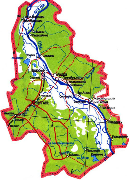 Административный центр — посёлок городского типа Октябрьское... Октябрьский район расположен по обе стороны нижнего течения Оби. С севера на юг он протянулся на 258 км, с запада на восток – на 166 км. Общая площадь района равна 24,5 тыс. кв. км.