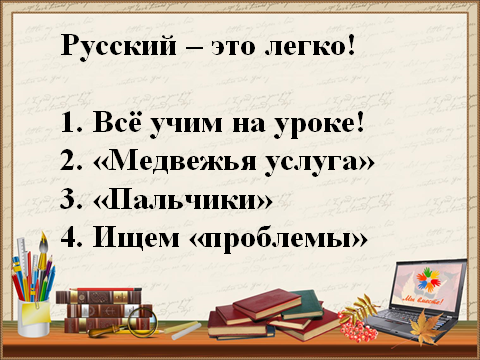1. Всё учим на уроке! (На каждом уроке 3 – 4 минуты отводится на запоминание правил, определений, четверостиший, обучающиеся в парах проводят взаимопроверку выученного)