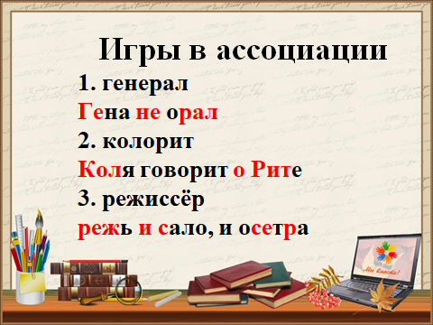 7. Игры в ассоциации (Запоминание словарных слов облегчается, если обучающиеся сами придумывают фразу, содержащую словарное слово)