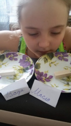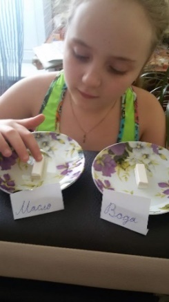 Результат: Мел впитал воду быстро. На масло у мела ушло немного больше времени, но и его на блюдце почти не осталось.