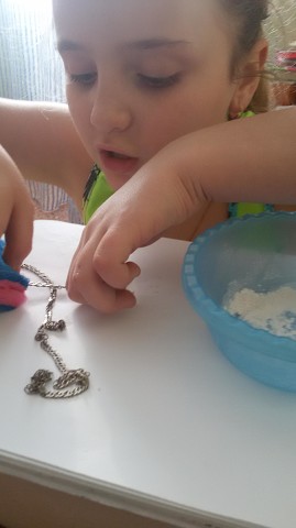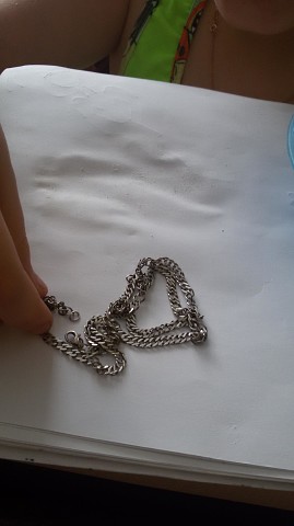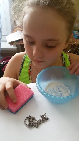 ак как мел легко превращается в крошку, то мы решили попробовать почистить им столовые приборы и серебряную цепочку! Вот что из этого получилось!