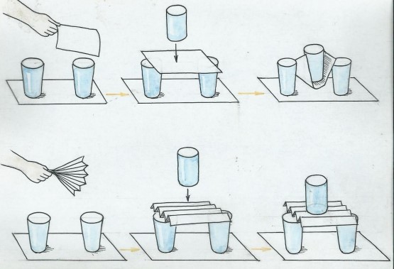 Кладем, сложенный гармошкой лист, на два стакана, а сверху третий.