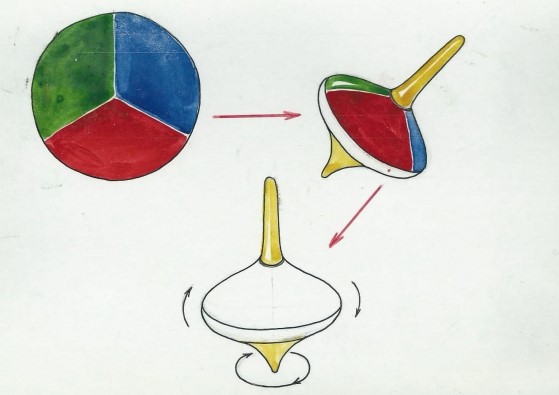 Берем волчок (или делим круг на три равные сектора и раскрашиваем в три цвета: синий, зеленый, красный) .