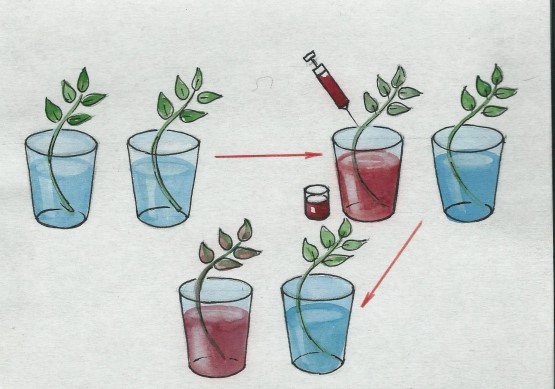 Через некоторое время: в этом стакане листья и стебель приобретут красный оттенок: растение пьет воду.