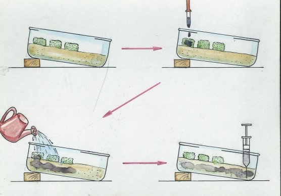 Берем контейнер, насыпаем песок, кладем губки. Один край контейнера стоит на подставке.