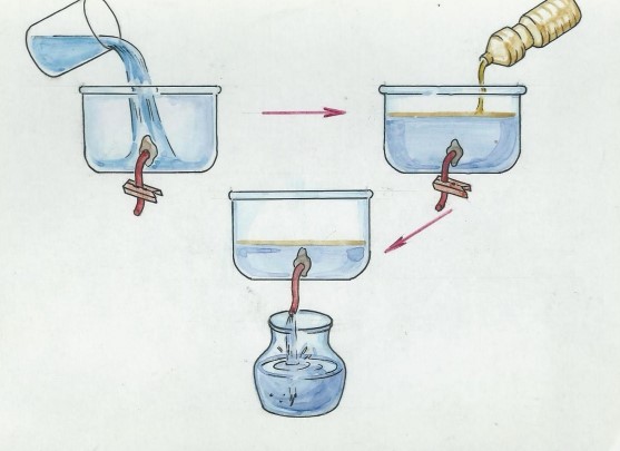 Убираем прищепку, сливаем половину воды в банку. В банку сливается не смешанная с маслом вода. Разлив масла образует пленку, как и нефть, которая представляет собой серьезную опасность для живой природы.