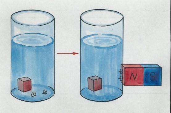 Подставитьмагнит к стенке стакана:магнит притягивает только металлические предметы, даже через стекло и воду.