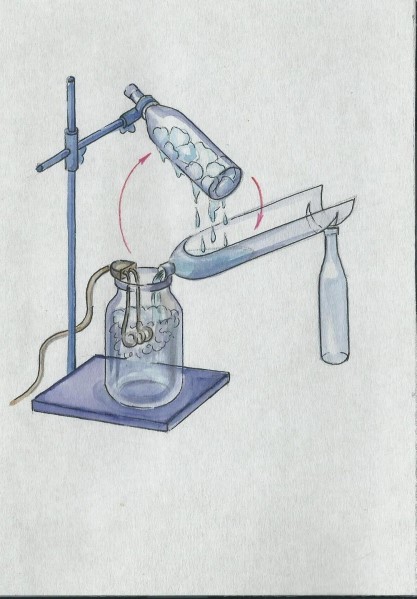 Включаем кипятильник, пар поднимается вверх, охлаждается, стекает в обрезанный баллон и из него обратно в банку.