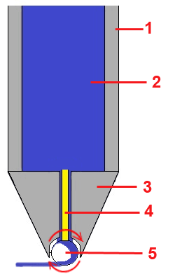 1 -стержень, 2 - чернила, 3 - наконечник, 4 - полая трубочка, 5 - шарик.