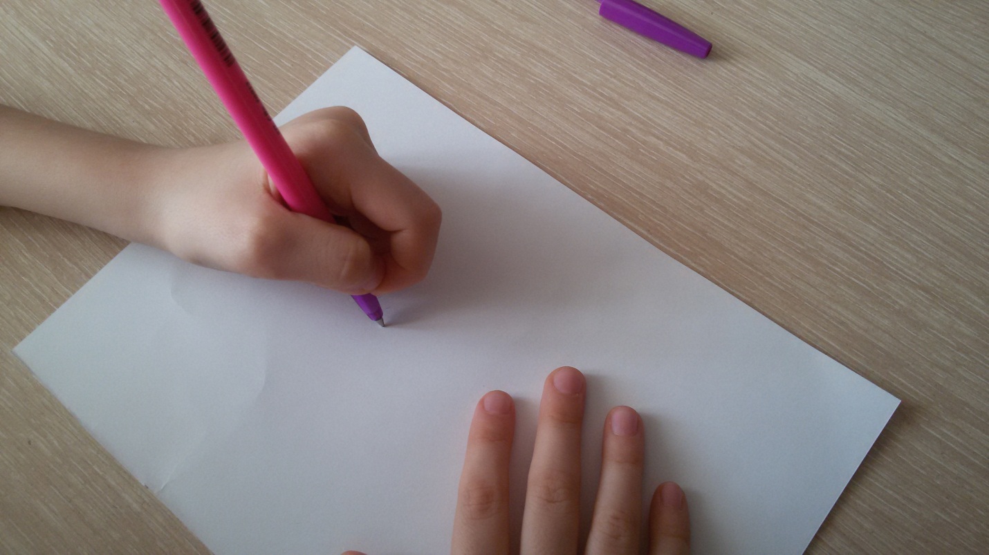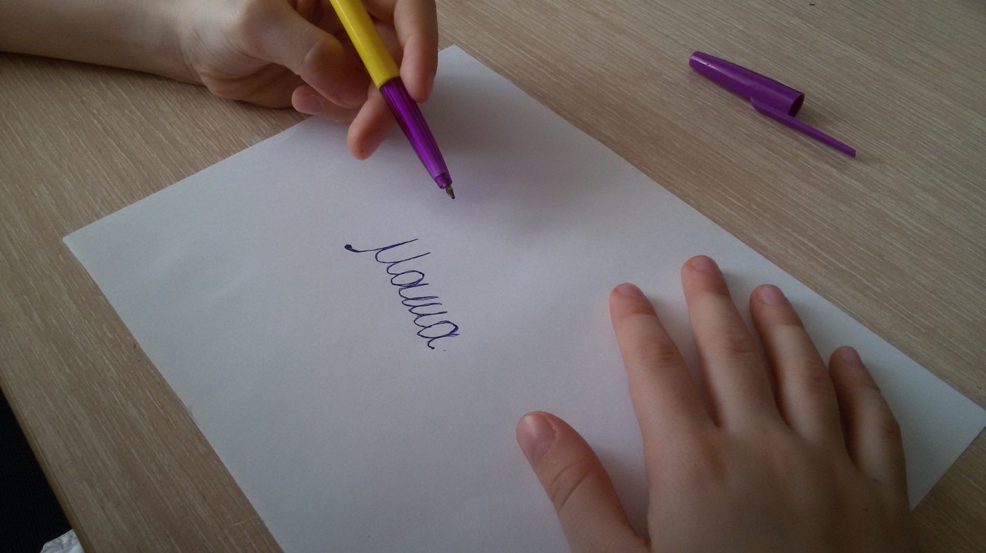 Потом я попробовала писать стоя, держа лист бумаги на стене (Приложение 4). Сначала буквы появлялись на бумаге, а затем ручка перестала писать, потому что находилась в горизонтальном положении и чернила не попадали на шарик. Поэтому писать лучше сидя за столом, а не стоя и не лёжа в кровати.